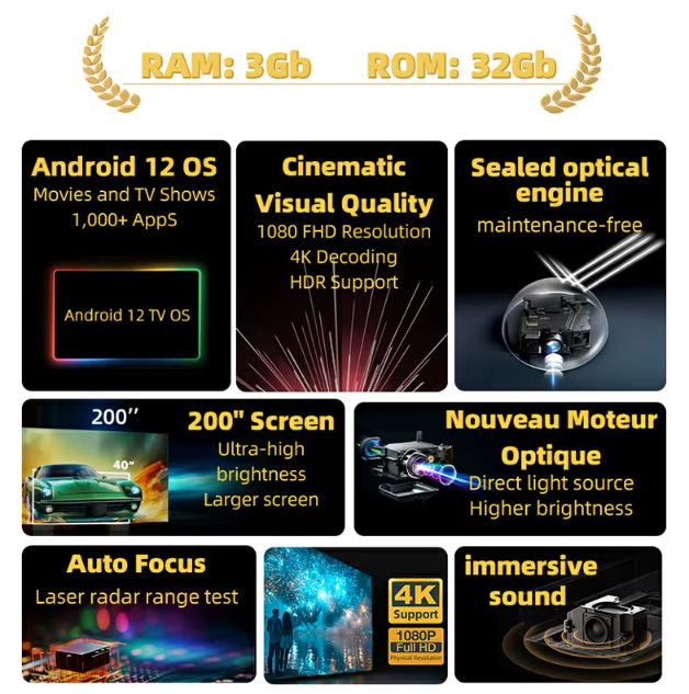 Luminosidade de 12000 lúmens:Projetar imagens vivas em até 200 polegadas com uma luminosidade de 12000 lúmens.