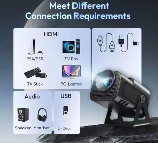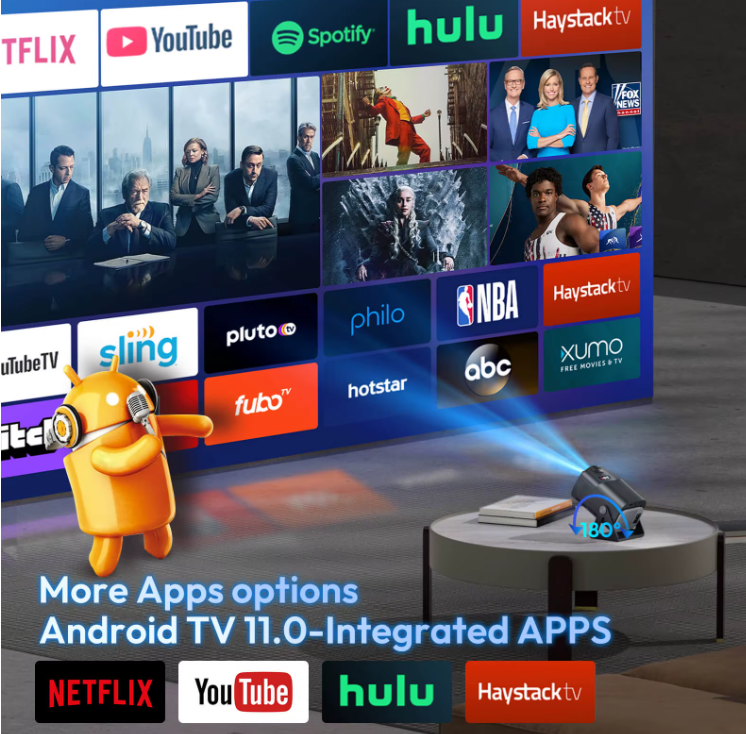 Com resolução nativa 720P e suporte a conteúdo em 4K, você desfruta de imagens mais nítidas e cores vibrantes para filmes, séries, jogos e apresentações. Equipado com sistema Android 11, permite acessar aplicativos diretamente no projetor, sem precisar de dispositivos externos.
