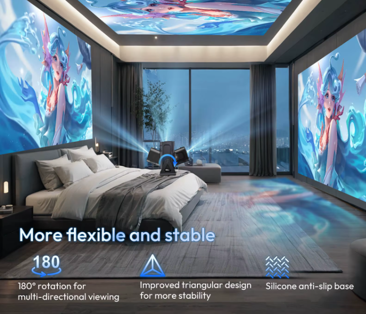 A conexão WiFi 6 garante maior estabilidade e velocidade na transmissão, enquanto o Bluetooth 5.0 facilita a conexão com caixas de som, fones ou outros dispositivos. Além disso, seu design com rotação de 180° possibilita projetar imagens em diferentes ângulos, inclusive no teto, trazendo mais conforto na hora de assistir.